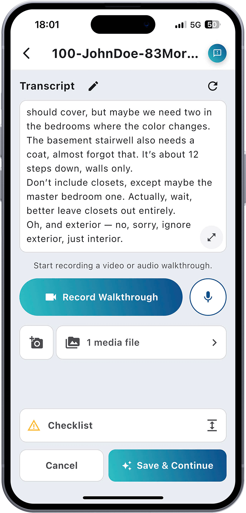 Walk the job with your phone in hand. Hit record, talk it through, and Tally turns your words into a clean transcript automatically.